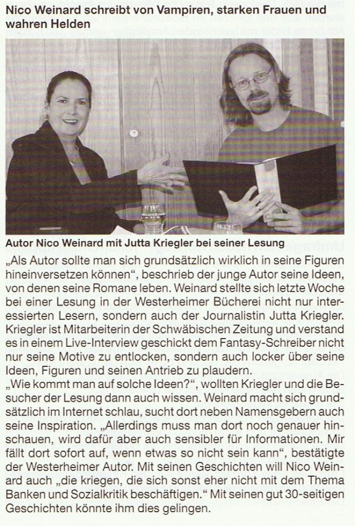 Präsentiert von Jutta Kriegler von der Schwäbischen Zeitung las ich zuerst aus meiner aktuellen Vampir-Reihe Chronik von Chiara und stellte mich anschließend im Interview den Fragen des Publikums.